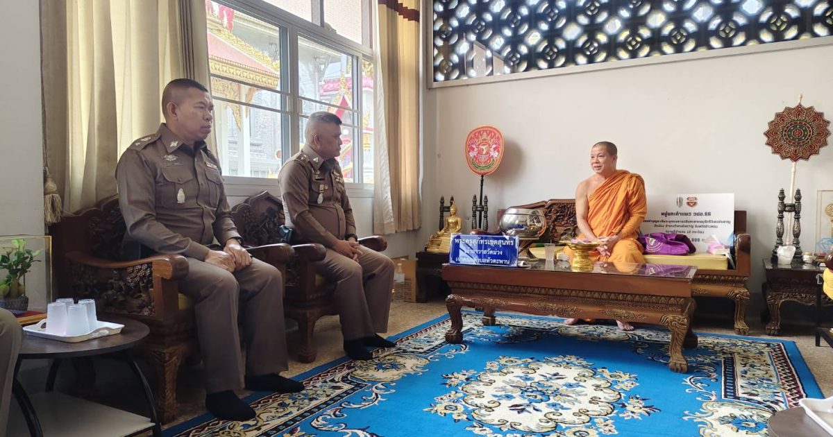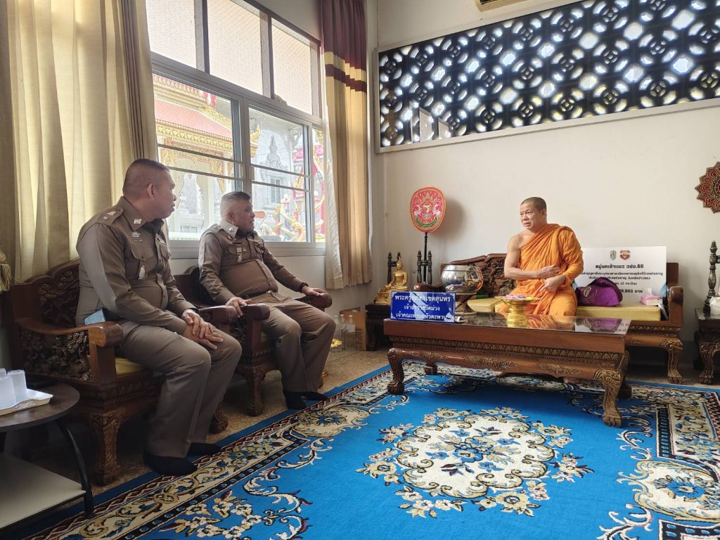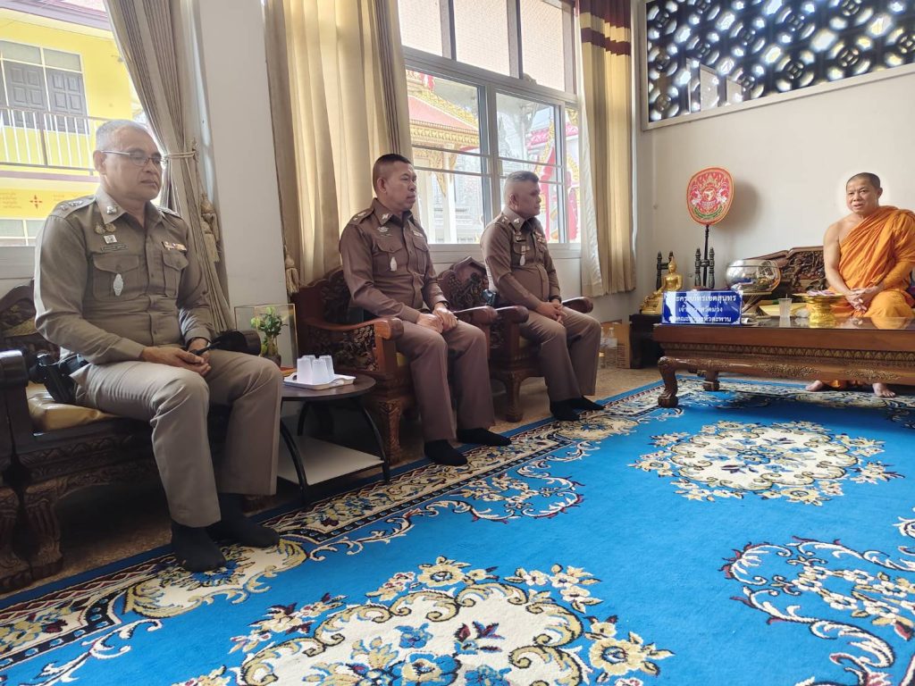 พ.ต.อ.ศุภกฤช เดือนแจ้งรัมย์ผกก.สภ.วิเศษชัยชาญ พ.ต.ท.ประภาส พรหมคล้าย รอง ผกก.ป.สภ.วิเศษชัยชาญ พ.ต.ท.สฤษฏ์พงศ์ จุลพันธ์ สวป.สภ.วิเศษชัยชาญ เข้ากราบนมัสการพระครูสุภัทรเขตสุนทรเจ้าอาวาสวัดม่วง ม.6 ต.หัวตะพาน อ.วิเศษชัยชาญ จ.อ่างทอง