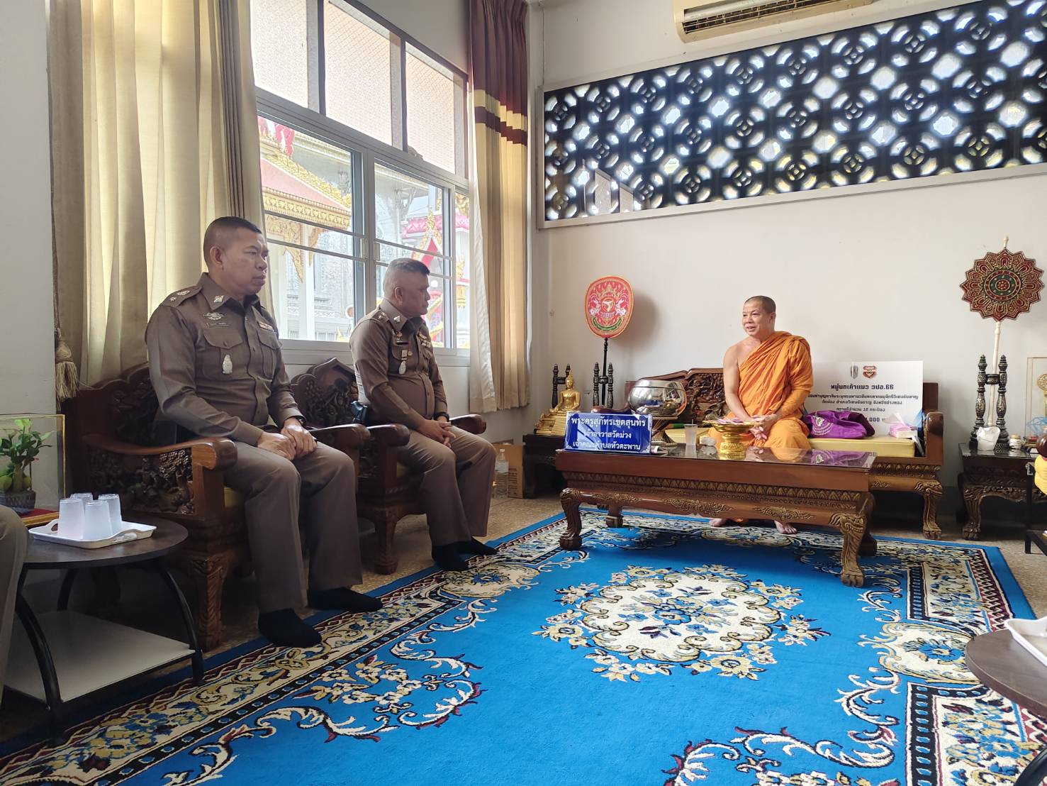 พ.ต.อ.ศุภกฤช เดือนแจ้งรัมย์ผกก.สภ.วิเศษชัยชาญ พ.ต.ท.ประภาส พรหมคล้าย รอง ผกก.ป.สภ.วิเศษชัยชาญ พ.ต.ท.สฤษฏ์พงศ์ จุลพันธ์ สวป.สภ.วิเศษชัยชาญ เข้ากราบนมัสการพระครูสุภัทรเขตสุนทรเจ้าอาวาสวัดม่วง ม.6 ต.หัวตะพาน อ.วิเศษชัยชาญ จ.อ่างทอง
